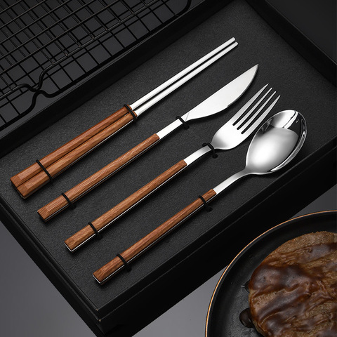 Juego de cubiertos desechables de acero inoxidable, mango de madera de imitación, cuchara de té occidental, sopa, bistec, tenedor, vajilla de comedor, traje de espejo